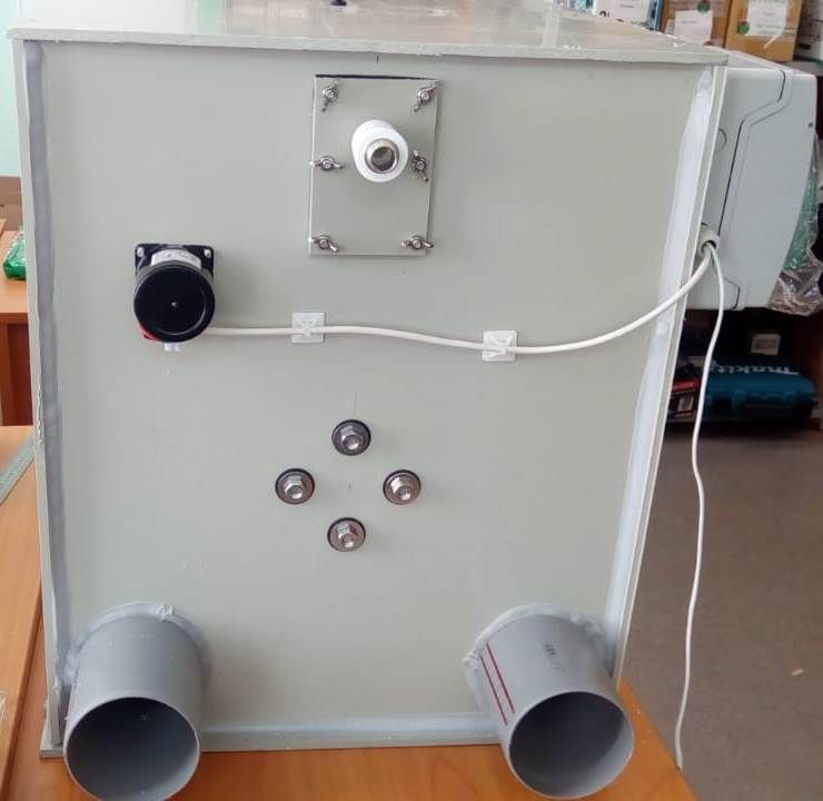 Выход и вход две трубы по 110мм, выход промывки в канализацию 50мм.